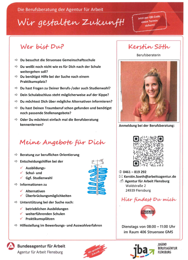 Eine Mitarbeiterin des Berufsinformationszentrums Flensburg bietet im Berufsvorbereitungsraum der Schule wöchentlich eine Sprechstunde an, berät und begleitet die Schülerinnen und Schüler bei ihrer Suche nach Praktikumsplätzen und Ausbildungsstellen.