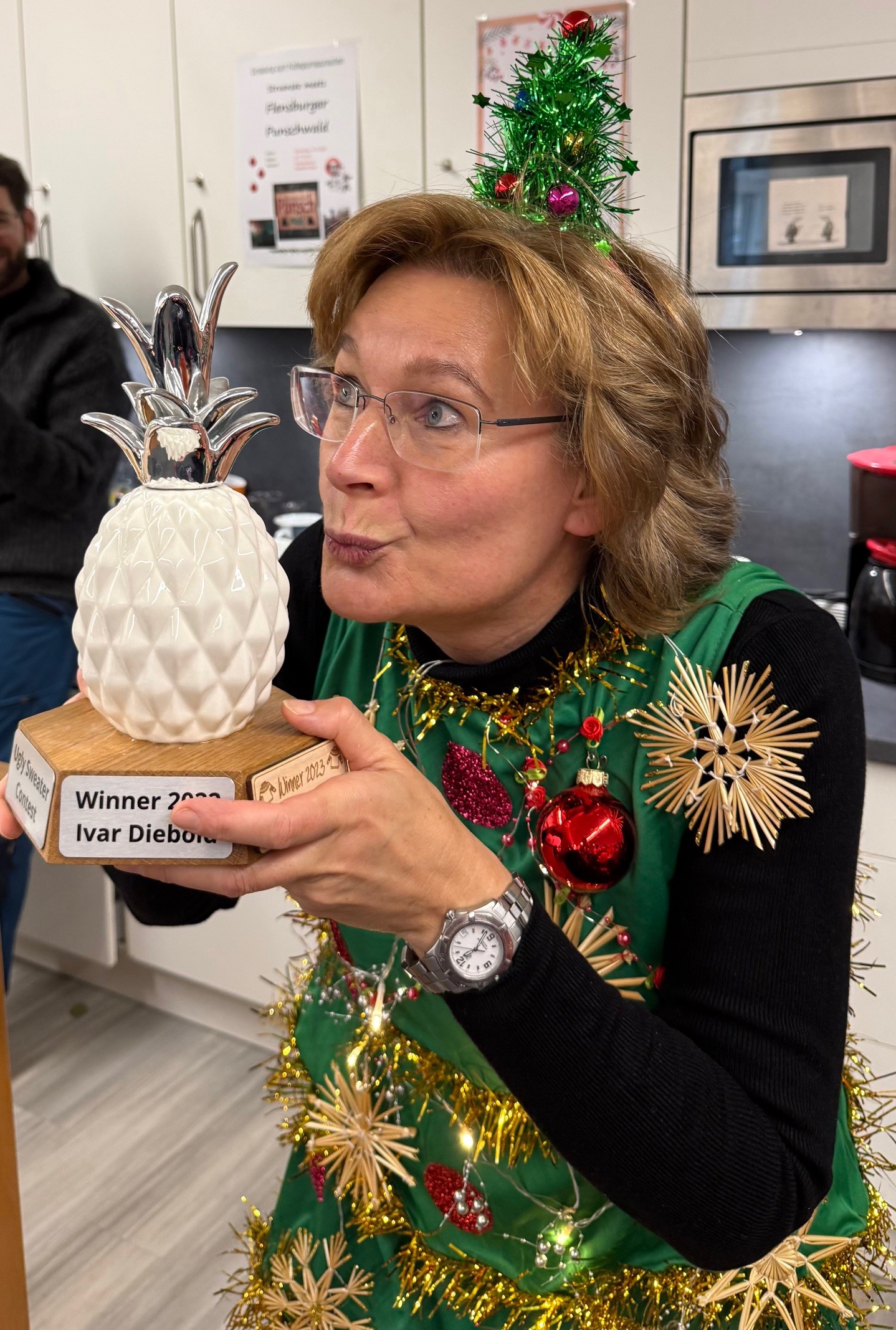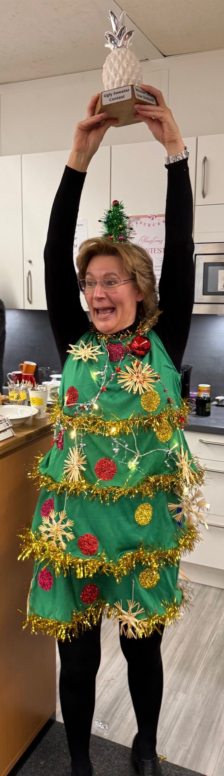 In diesem Jahr hat Frau Towers die meisten Stimmen erhalten und den Wanderpokal „Die weiße Ananas“ gewonnen. Sie hat sich riesig gefreut!