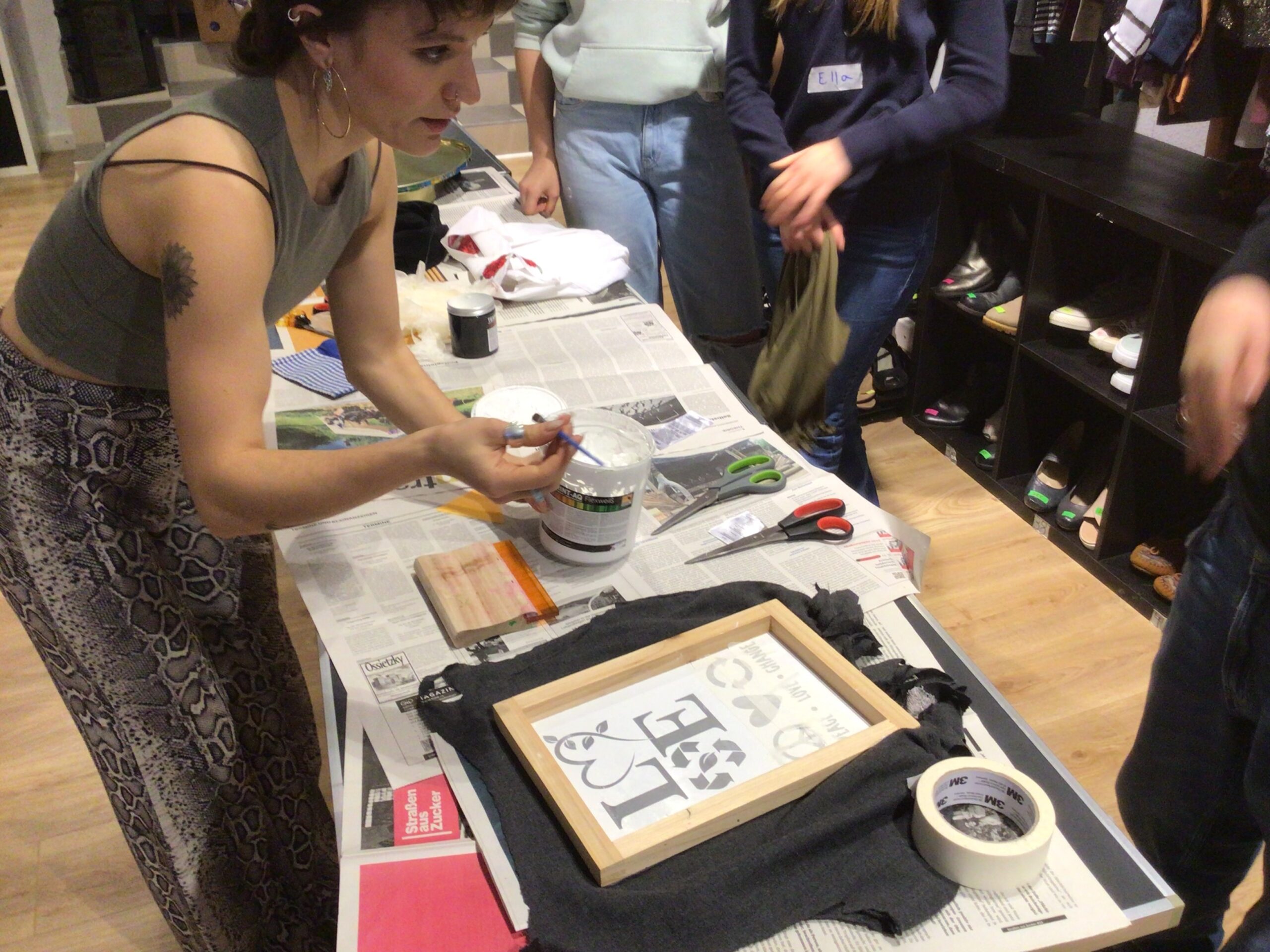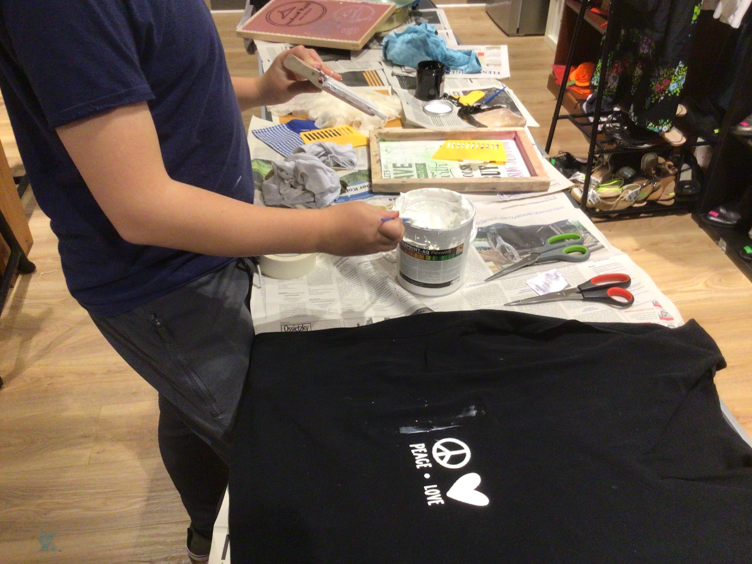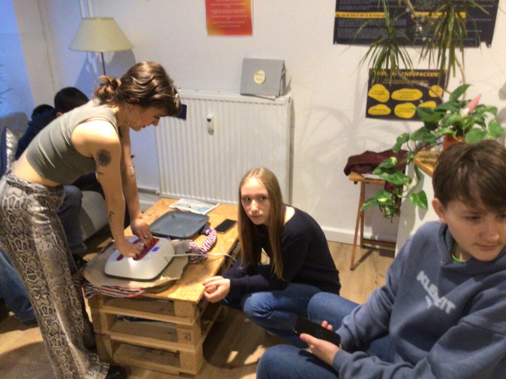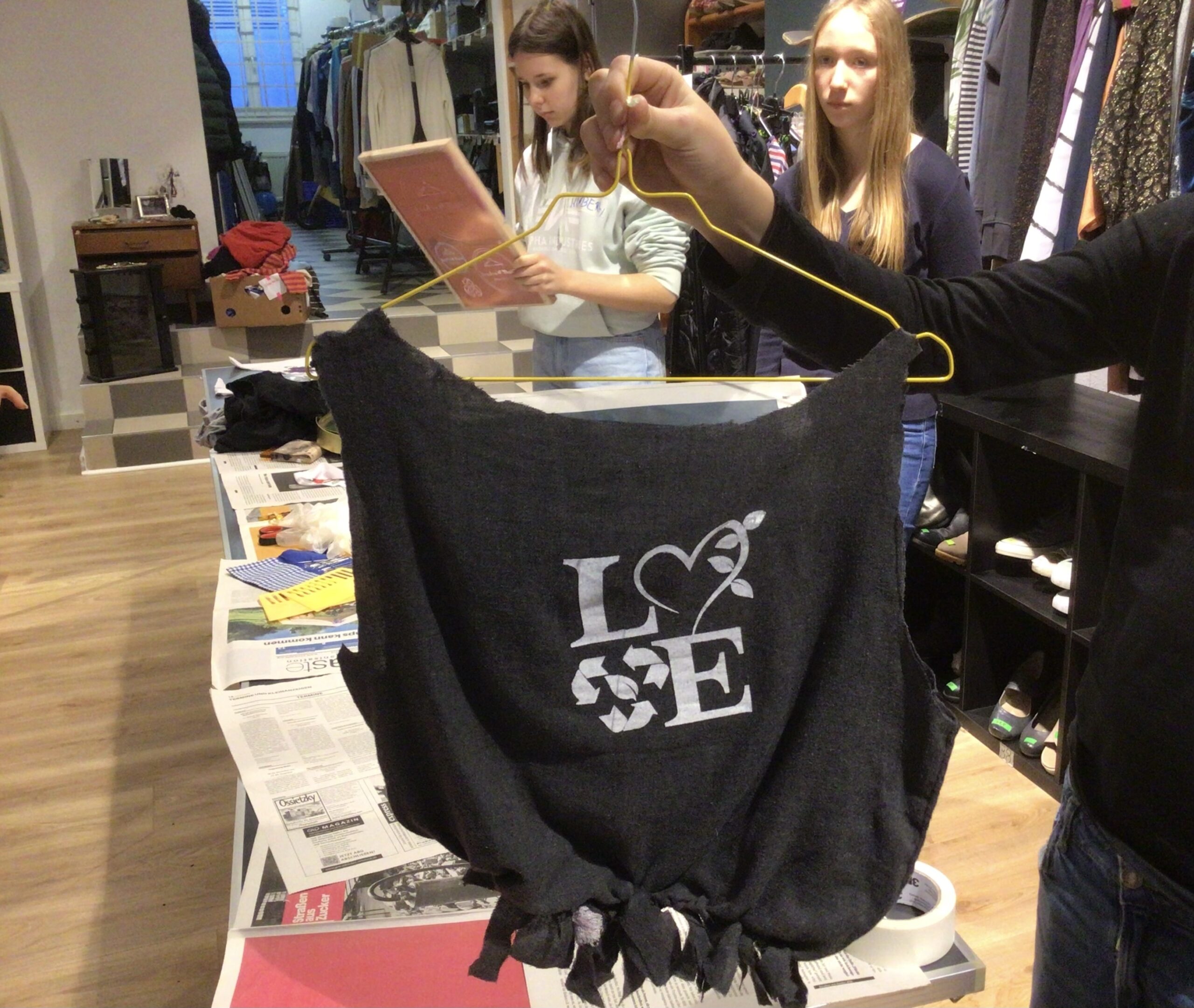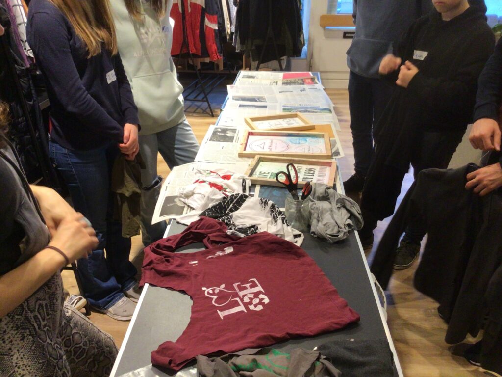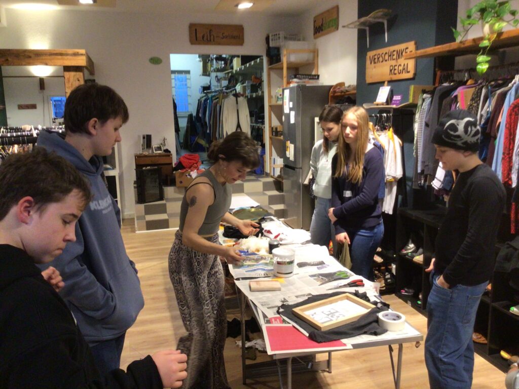 Statt sich immer wieder neue Kleidung zu kaufen, kann man bei „StoffWechsel“ Kleidungsstücke, die nicht mehr gefallen, abgeben und sich im Gegenzug andere Kleidungsstücke aussuchen. Und so stöberten die Jugendlichen interessiert im Angebot des Tauschladens, sodass einige Schülerinnen und Schüler fündig wurden und ein für sie neues Kleidungsstück mit nach Hause nehmen konnten. Anschließend erhielten die WPU-SchülerInnen sogar noch ein textiles Kreativ-Angebot: Die Jugendlichen durften sich alte T-Shirts aussuchen und daraus Taschen herstellen, welche abschließend mit Siebdruck und / oder Plotter-Motiven individuell gestaltet wurden.
